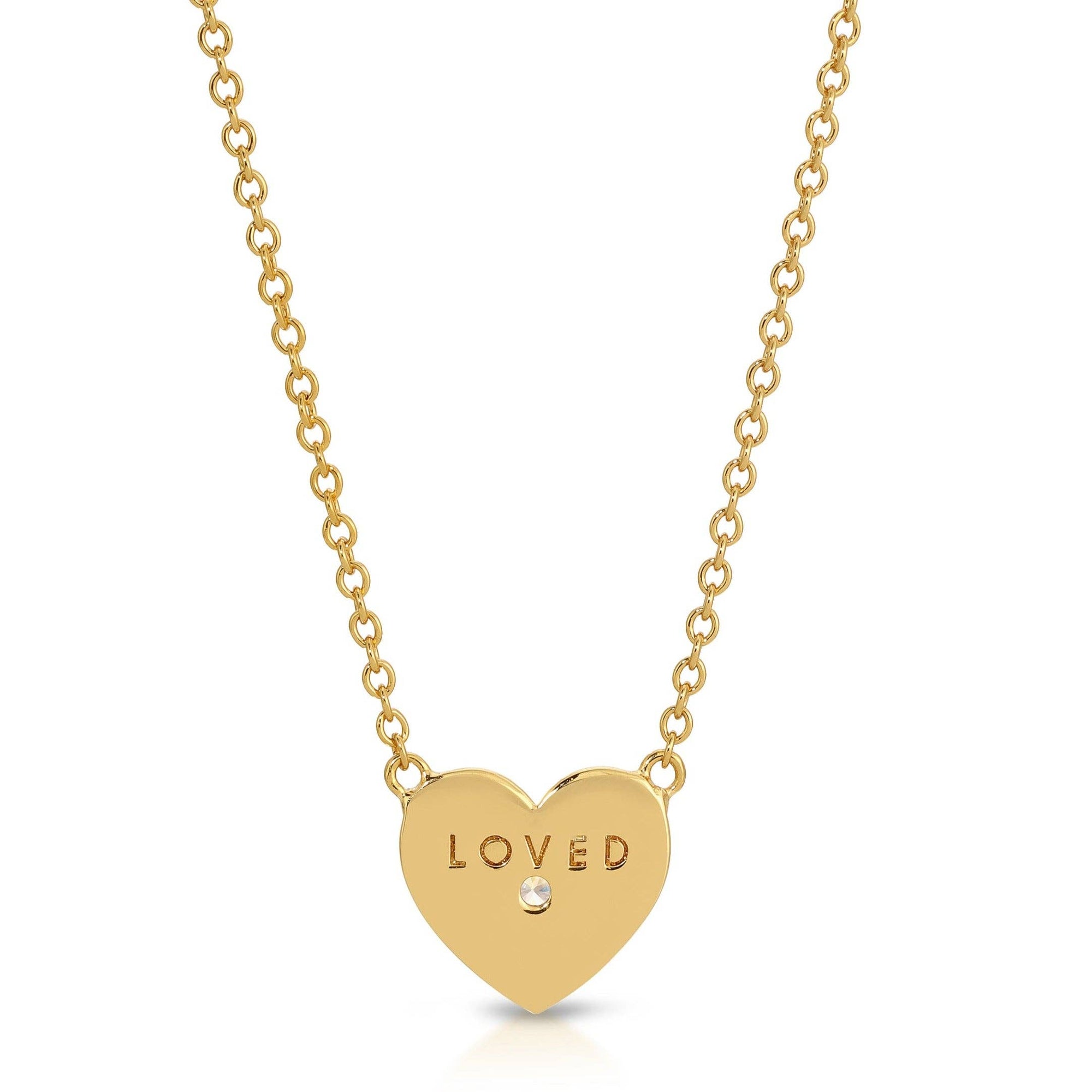 Materials: 16"-18" Necklace; Fluted heart pendant with CZ accent. 14K Gold plated Brass, back reads "Loved"