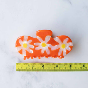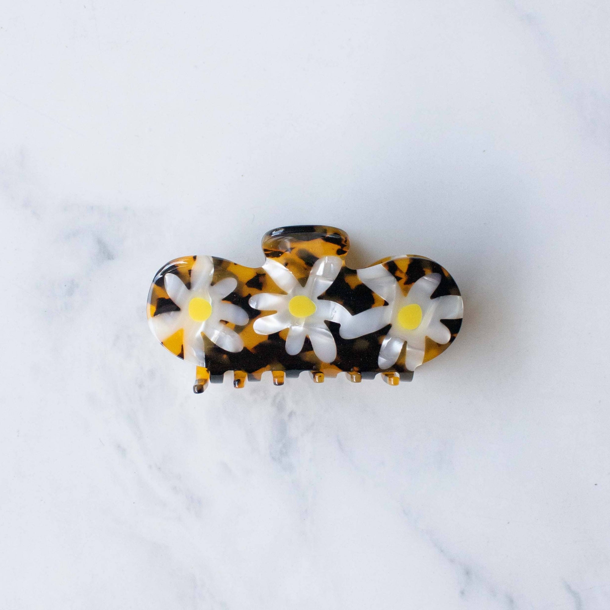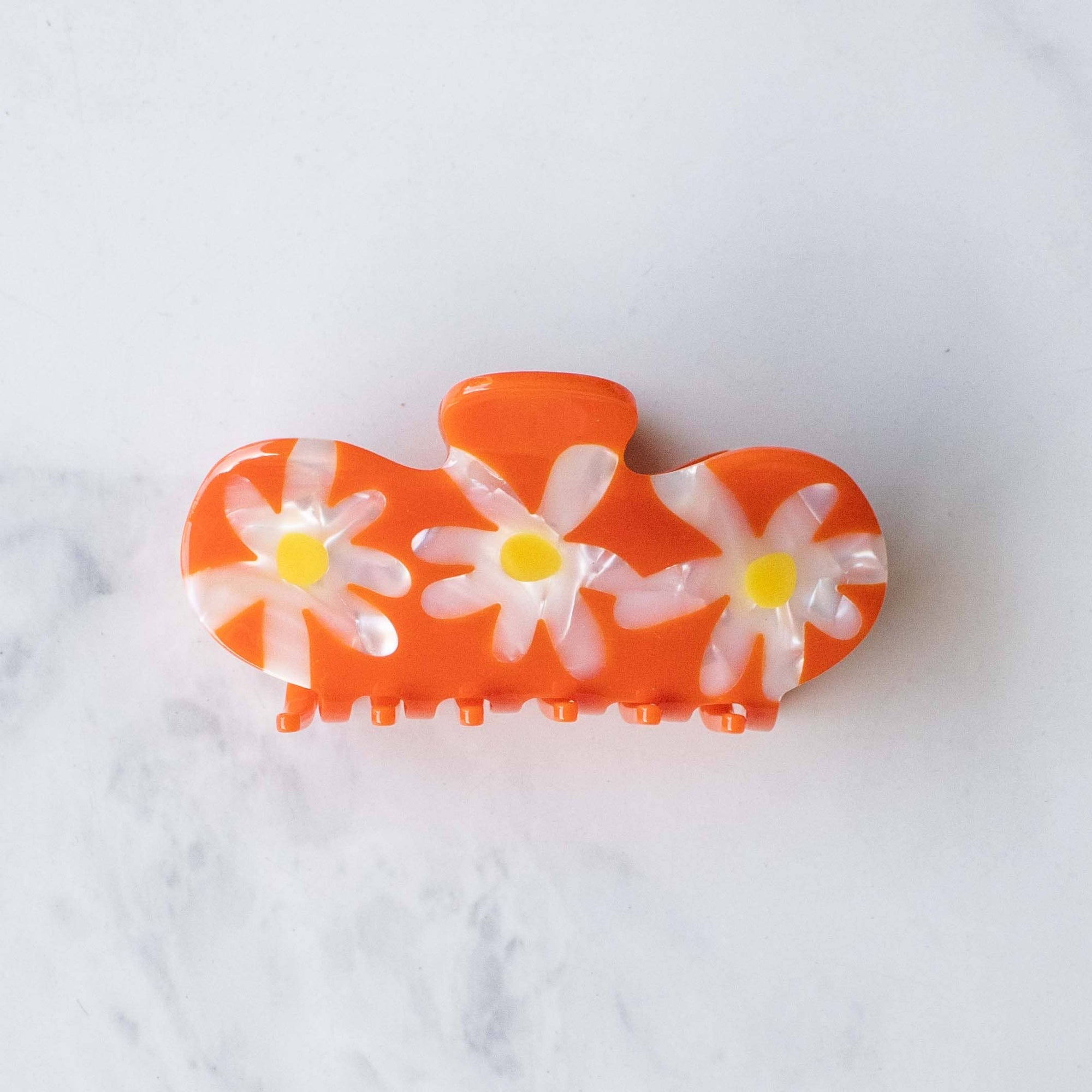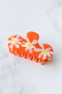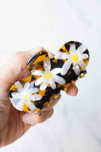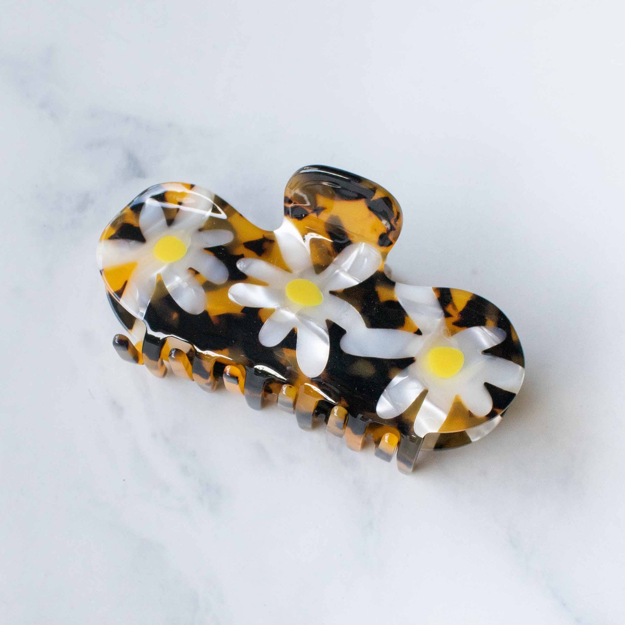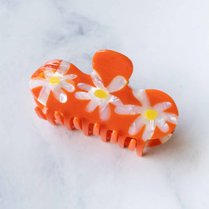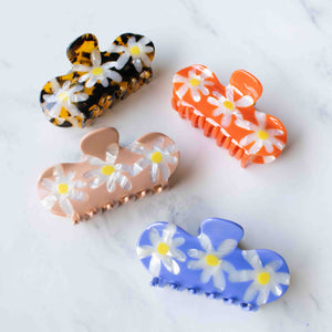 Material: Cellulose Acetate Usage: Secure and stylish hair accessory for daily wear or special events Enhance your hairstyle with these charming floral hair claw clips. These clips feature a vibrant daisy design on a glossy finish, adding a touch of elegance and playfulness to your look. The sturdy claw mechanism provides a secure grip, making them perfect for all hair types. Available in four stylish colors-Amber,Blue,Mocha, and Orange-these clips are ideal for everyday wear or special occasions. Perfect for adding a cute and trendy accent to any outfit!