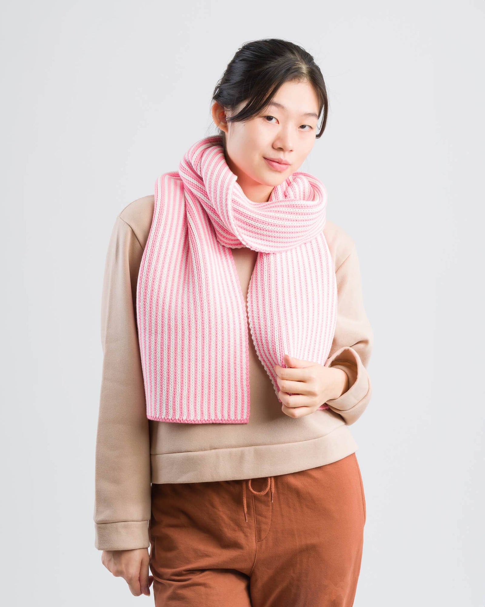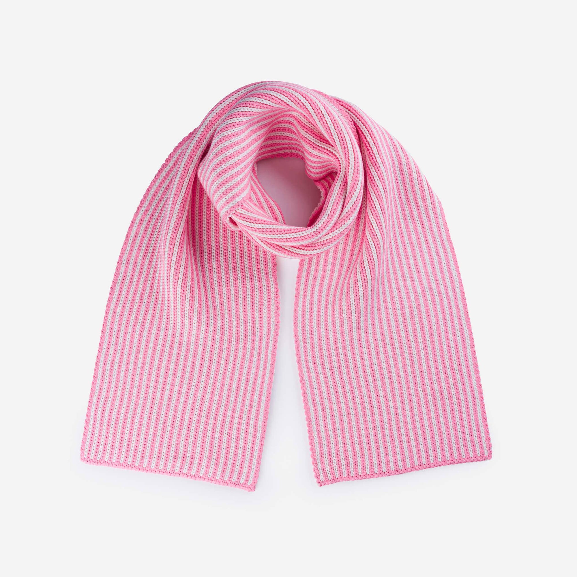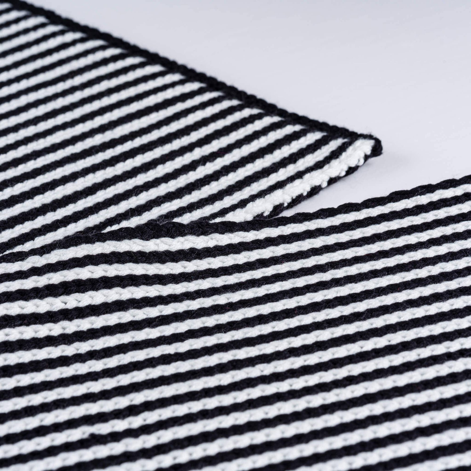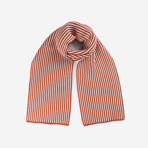 Oversized, two-tone rib knit scarf. A big, comfy, striped scarf to be enjoyed all fall and winter. Can be worn long or wrapped up like a cowl for extra warmth. Make it a matching set (or the perfect gift) with our striped knit mittens. Reversible pattern knit with new and repurposed hypoallergenic yarn.